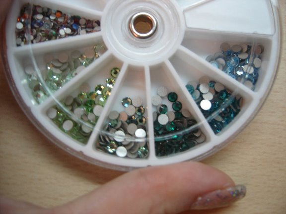 因為不想通通貼白鑽(這樣太普通了!) 所以買了六個顏色的水晶 (各種綠色) 想來個綠色漸層